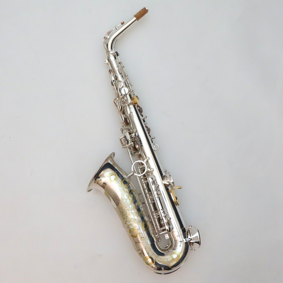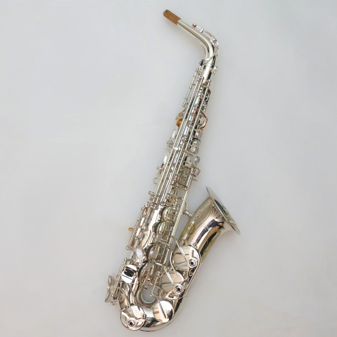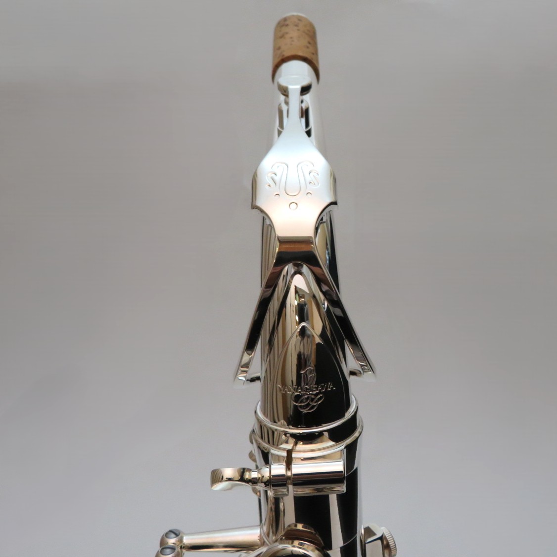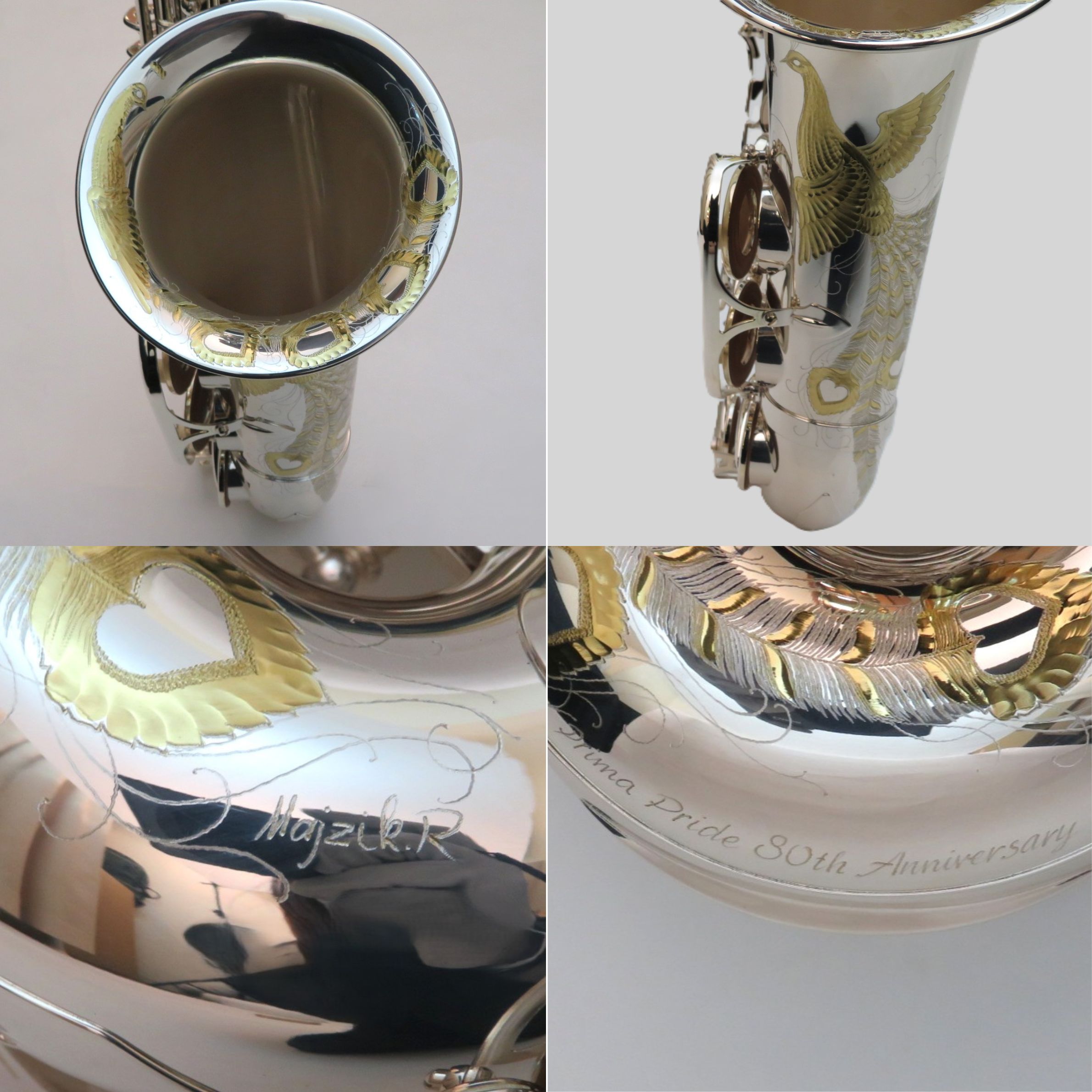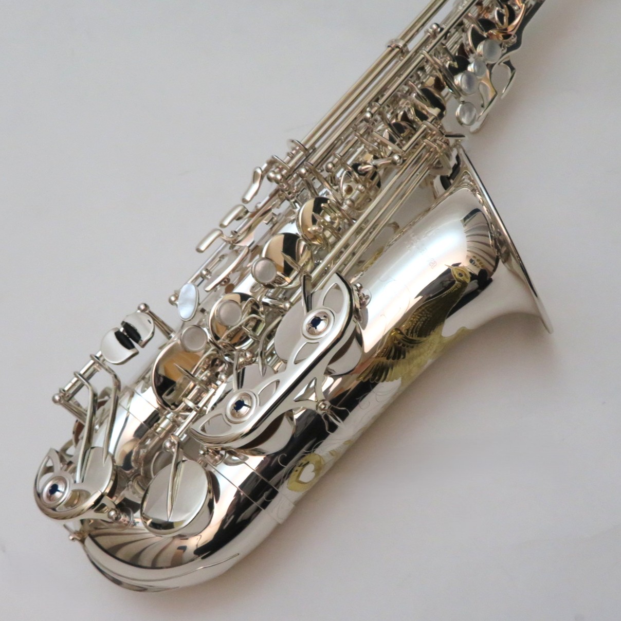 ■仕様:E♭、High F#キー付、ネック:スタンダード・スタイル(ブラス製銀メッキ仕上)、管体:ブラス製銀メッキ(ベル:1番管のみ銀メッキ クリアラッカー仕上)、グラヴィール彫刻入、キーSP、フロントFキーPGP、サムの魔法使いGP、ダブル・アーム・キー、キーガード止めネジ:切削マイナスネジ、高気密防水タンポ+メタル・ブースター